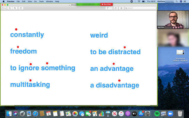 Teachers use resources from our books and online videos to develop grammar, vocabulary and reading, writing, listening and speaking skills. Work is also provided for students to complete between lessons if required. We use Zoom as the easiest, most powerful platform out there.