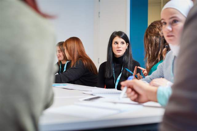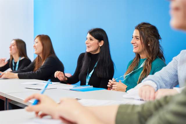الجنسيات والاعمار مختلطة في المدرسة ودورات عديدة ومستويات عديدة وبفترات زمنية مختلفة. متوسط الاعمار هو 28 طوال العام.