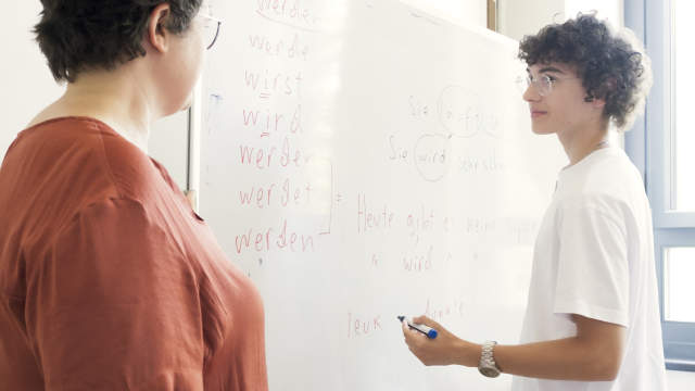 في جميع مراكزنا للمراهقين تقريبًا، نقوم بتدريس دورات مكثفة باللغة الألمانية مع 30 درسًا في الأسبوع. والدروس مصممة بشكل خاص ومصممة للطلاب المراهقين: فهي تفاعلية وممتعة، ولكنها في الوقت نفسه تتطلب الكثير من الفعالية.
