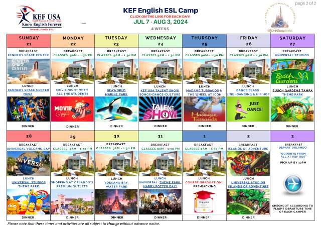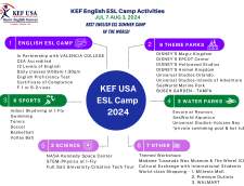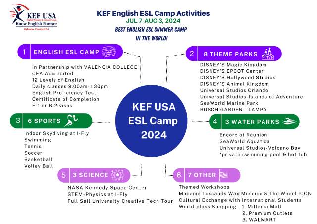 The KEF USA ESL English summer camp offers an intensive program designed for students eager to maximize their language learning while enjoying all the Orlando. This camp places a strong emphasis on speaking and communication skills, with mornings dedicated to communication-focused lessons and afternoons to two lessons on special topics. These sessions provide students with insights into American culture and customs.The program is accredited by the CEA, the highest accreditation in the U.S.